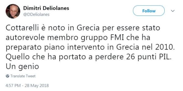 Come da attese Carlo Cottarelli, ex FMI, corresponsabile dei disastri fatti in Grecia con l’eccesso di austerità (era nel team FMI che “lavorò” in Grecia con la Troika, ma sostenendo che le colpe fossero del superiore diretto, Olivier Blanchard, che ha – o aveva – le spalle più larghe, sembrerebbe, …) torna alla carica per imporre una grande patrimoniale alle famiglie italiane, dopo che la pianificata patrimonialona di Sabino Cassese da Atripalda è stata cassata dall’inatteso arrivo a Palazzo Chigi dei gialloverdi (memento: il Cassese è molto vicino al figlio di Giorgio Napolitano, oltre che compaesano di Pellegrino Capaldo, colui che l’ha ideata nei dettagli tecnici; andatevela a rivedere almeno vi portate avanti col lavoro, ndr).