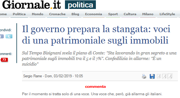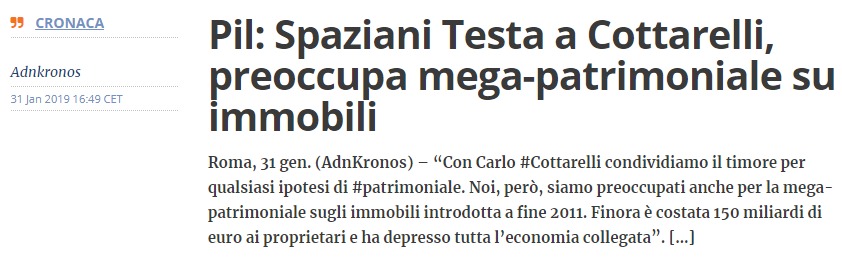 Notando per altro, a livello macreconomico, che Cottarelli – un vero esperto di economia, forse dovrei dire un sicario dell’economia – vorrebbe imporre tale pesantissima imposta straordinaria (per precisa ammissione dell’economista) come conseguenza di un evento fortemente recessivo dell’economia italiana come una caduta del PIL di oltre l’1%! Della serie, se il PIL italico per varie ragioni – magari NON imputabili all’Italia, ad es. una recessione globale, probabile – scendesse dell’1% allora bisognerebbe aggiungerci una ulteriore imposta patrimoniale pari – che so – al 10% del valore degli immobili degli italiani. Almeno il PIL Italiano invece di scendere dell’1% crollerebbe del 4 o 5%, costringendo ad ulteriori imposte patrimoniali anche sul patrimonio mobiliare. ecc. ecc. Una Grecia al quadrato contando il valore (delle famiglie) dissipato in tasse inutili quanto meno per risollevare il Paese! [ma utilissime a trasformare l’Italia in una colonia, ndr]