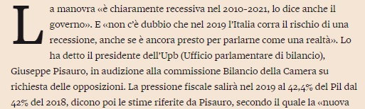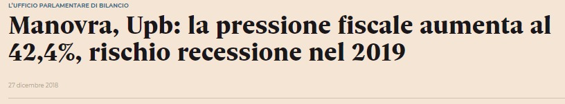 Pochi ricordano oggi che la tassazione media sul PIL dell’Italia è salita con l’ultima finanziaria gialloverde. Infatti il paese non cresce, normale. Un mediaticamente famoso economista che scrive su scenarieconomici, che un mese fa difendeva a spada tratta il 2.04% (“tanto si sfora dopo, una cosa è quello che si dice, l’altra quello che si fa….”, vi ricordate?), sabato l’ho letto affermare che bisognava fare più deficit in manovra. Scusate, ma dov’era costui quando noi criticavamo il governo per aver ceduto alla riduzione del deficit da manovra economica? (senza per altro spiegare che il governo fu letteralmente ricattato dall’EU via spread). Forse era a criticare chi criticava? Non aggiungo altro.