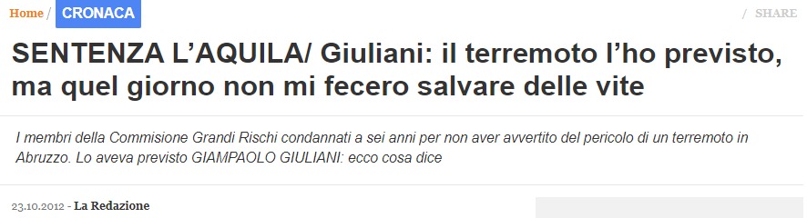 Chiaro, i terremoti ufficialmente non si possono prevedere. Questo è vero fino a prova contraria. Infatti nel caso de L’Aquila (2009) il devastante terremoto venne correttamente previsto dal tecnico Giampaolo Giuliani (ex tecnico dell’Istituto di Fisica dello Spazio Interplanetario distaccato presso i Laboratori Nazionali del Gran Sasso), che però non venne ascoltato dai vertici politici. Ci fu anche una sentenza di condanna in riguardo, vedasi sopra.