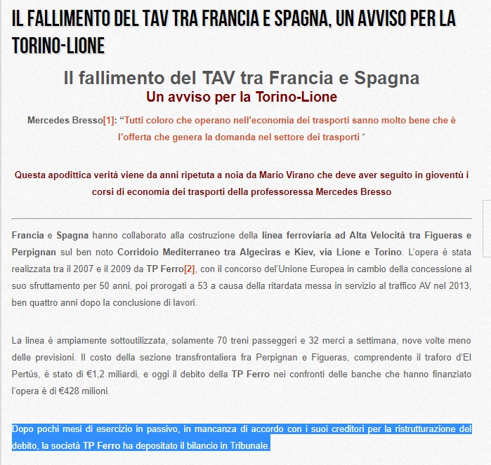 Fino a ieri pensavo di essere l’ultimo dei mohicani. Nel senso che, dati alla mano, come dimostrato del super tecnico Ponti (che resta il maggior esperto italiano in tali valutazioni, per altro avendo fatto per anni lo stesso lavoro alla banca mondiale), la TAV è un’opera sostanzialmente inutile. Il problema è che i media, gli stessi che hanno sostenuto il PD ed i quattro governi non eletti che hanno portato al disastro il Paese, oltre ad essere stati da sempre filo EU e filo globalisti, con un bombardamento continuo di disinformazione vogliono farci credere che detta TAV è un’opera non solo utile ma addirittura necessaria per la rinascita del Paese. Lo scrivo a futura memoria: la TAV è un’opera più che inutile, dannosa, visto che sarà in perdita e tali perdite dovranno essere ripianate con le tasse dei cittadini. Oltre al danno la beffa. Poi non lamentatevi se ci sarà l’ennesimo fallimento italiano, io vi ho avvertiti.
