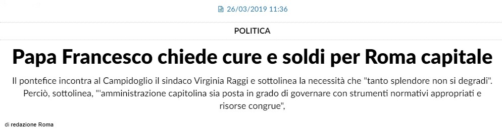 Il segnale che suona a morto per l’Italia – a conferma di quanto sopra – è però la mossa a sorpresa di Bergoglio che, in veste di vescovo di Roma, la scorsa settimana si è recato dal sindaco Raggi non per chiedere di salvare le anime dei romani ma di richiamare l’amministrazione capitolina a preservare il bene materiale “Roma” ossia curandolo meglio, a partire dalla strade.
