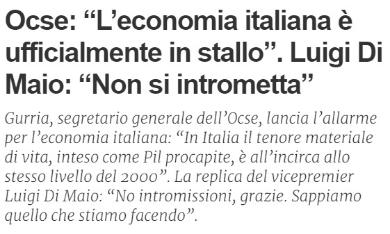 Agli atti pratici ieri Di Maio ha – encore – detto chiaramente a Gurria (OCSE) di smettere di ingerire come OCSE nei confronti dell’Italia ossia che “l’austerità se la facesse a propria“. Applausi.