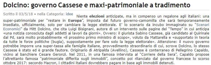 Roberto Dagostino, patron di Dagospia, normalmente informatissimo, ieri ha fatto affermazioni pesantissime addirittura su Italiaoggi, ossia ad uno dei quotidiani economici più rinomati d’Italia (non su Dagospia!). Parlando addirittura di economia. In sostanza il giornalista romano – verrebbe da dire troppo ben informato per fare solo il giornalista – ha affermato che se dopo le elezioni Europee se il M5S scenderà sotto il 20%, il Governo gialloverde cadrà e dunque arriverà un tecnico a fare un’imposta patrimoniale monstre a carico delle famiglie, per – aggiungo io – un valore pari anche a circa il 10% della ricchezza netta delle famiglie (il numero è aggiunto, sulla base di indicazioni passate simulate da vari enti tedeschi e francesi). O qualcosa del genere.