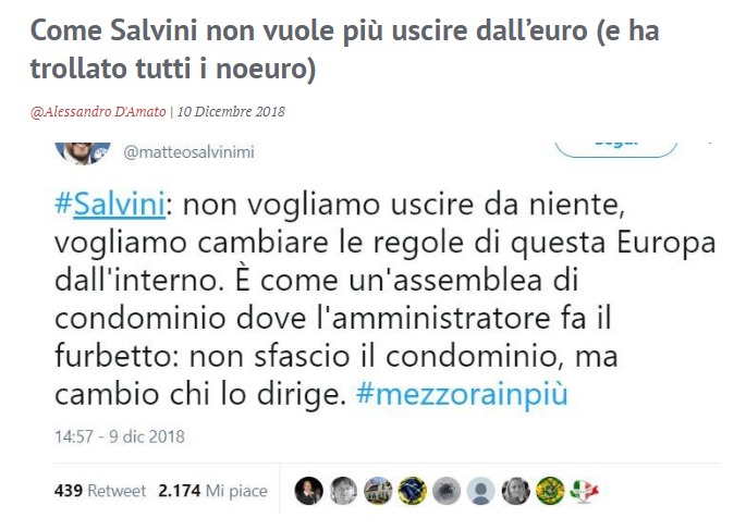 “Potevano scegliere fra il disonore (cfr. rinnegare l’uscita dall’euro) e la guerra (cfr. lo scontro con l’EU). Hanno scelto il disonore ed avranno la guerra” (ossia anche la patrimoniale). Non si può cambiare l’EU “dal di dentro”! Le prospettive per l’Italia