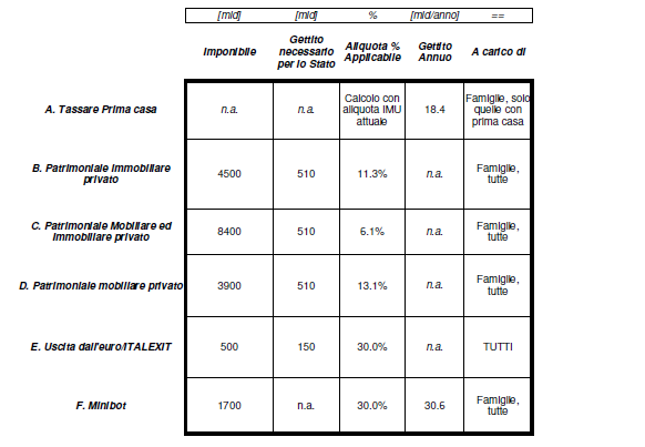 • la terza, i miniBOT, una tassa sul ceto medio-basso, sui rimborsi fiscali dati dallo Stato (proposta Siri, ossia caricata sui bonus, sulle detrazioni, sui rimborsi fiscali che annulamente sono presenti nella dichiarazioendei redditi).