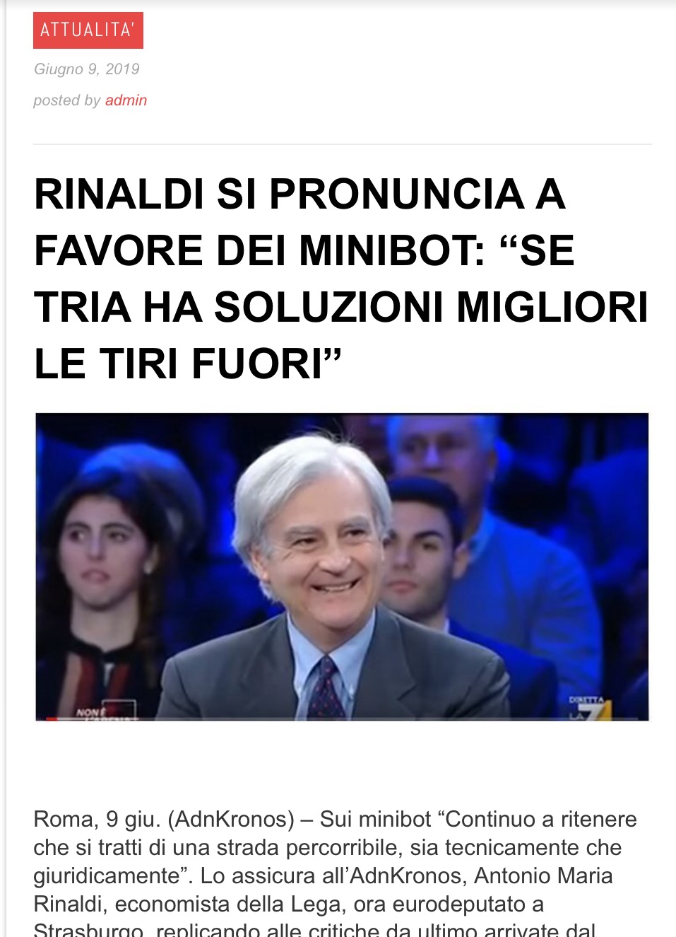 Come vedete tutto cambia perché nulla cambi, soprattutto nella politica romana. Sinceramente alla fine sono contento dell’outing di Rinaldi: nella vita bisogna prendersi delle responsabilità e quindi la scelta di ripudiare ufficialmente il proprio piano B dell’ITALEXIT a favore del piano A, i miniBOT, se non altro fa chiarezza sul proprio credo e sulla propria coerenza. In ogni caso così facendo quanto meno ci si prende la responsabilità pubblica delle proprie azioni e delle proprie decisioni: i miniBOT avranno infatti conseguenze per l’Italia e non solo, nel bene e nel male; oggi Rinaldi li approva, assumendosi le proprie responsabilita. Ricordate in futuro la parole di Rinaldi! Ai posteri l’ardua sentenza (che poi ritengo non sarà così ardua, per capirne gli effetti a posteriori…). Mitt Dolcino ***** Le immagini, i tweet e i filmati (i contenuti) pubblicati nel sito sono tratti da Internet per cui riteniamo, in buona fede, che siano di pubblico dominio e quindi immediatamente utilizzabili. In caso contrario, sarà sufficiente contattarci all’indirizzo info@mittdolcino.com perché vengano immediatamente rimossi. Le opinioni espresse negli articoli rappresentano la volontà e il pensiero degli autori, non necessariamente quelle del sito.