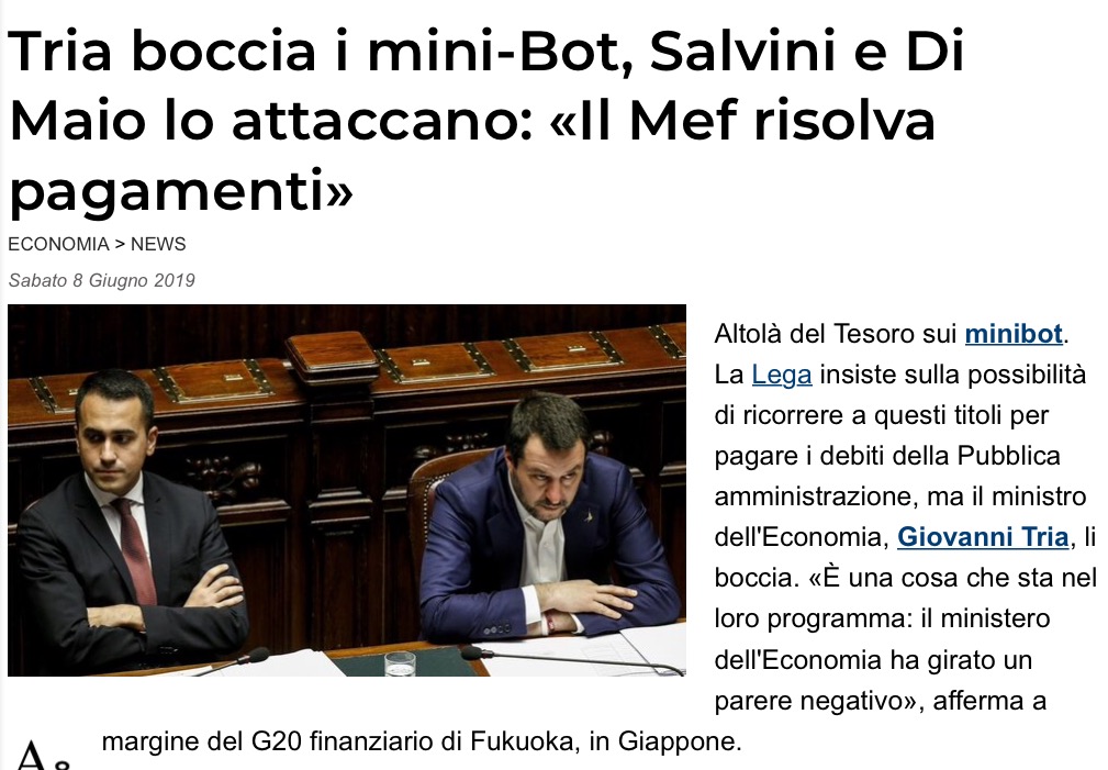 Le agenzie di stampa hanno battuto ieri la notizia, di cui al titolo (vedasi al LINK). Certo, non posso dire che non fosse attesa: Antonio Maria Rinaldi, quello che ha venduto a mari e monti il suo Piano B per l’uscita dall’euro (pro-ITALEXIT, in realtà mi verrebbe da dire che fu iniziativa più di GPG Imperatrice, a guardare bene, ma tant’è) oggi da onorevole leghista rinnega la sua creatura e preferisce i miniBOT di Armando Siri, il referente economico della Lega, ex uomo di Mediaset in Liguria. Questa è una notizia. Non tanto per il supporto ai miniBOT, che chi scrive continua – per il nulla che vale – a ritenerlo strumento assolutamente deleterio oltre che costosissimo e soprattutto iniquo (se si vuole fare una patrimoniale per uscire dall’euro che la si faccia, tutto sommato sarebbe risolutiva, ma che sia a carico di tutti e non principalmente della classe media e medio-bassa come invece sono i miniBOT), ma per chi oggi benedice tale scelta strategica governativa. La cosa interessante è infatti leggere le affermazioni secondo cui il soggetto che spingeva per il Piano B oggi dice “Se qualcuno ha soluzioni migliori le tiri fuori…” (…). Infatti Antonio Maria Rinaldi è – o forse era – anche e soprattutto il supposto delfino di Paolo Savona, ovvero di colui che, mentre era al governo, bollò quanto meno come inappropriata la scelta dei miniBOT (forse anche fesseria?), preferendo invece altre soluzioni più ortodosse come gli investimenti strutturali per fare aumentare il denominatore del rapporto debito/PIL (investimenti strutturali che invece non ci sono stati, ndr). Non a caso il ministro Tria, che fu scelto nel solco della linea di pensiero di Savona dopo il veto di Mattarella al nobile sardo, ha confermato la sua contrarietà ai miniBOT, guarda caso paventando più o meno le stesse argomentazioni dell’ex ministro alle Politiche Comunitarie oggi alla Consob, ostracizzato dai gialloverdi – anzi soprattutto dalla Lega – per la sua contrapposizione al progetto di Armando Siri, che poi era un progetto di Berlusconi fin del 2014, i miniBOT appunto.   Faccio notare che sia la Lega che il M5S sostengono che NON si vuole uscire dall’euro, ossia viene negata a prescindere la possibilità che detti miniBOT servano per pagare l’ITALEXIT, ad esempio saldando il Target 2 ; ossia – tradotto – i miniBOT saranno necessariamente uno strumento che dovrà essere tenuto in vita per anni, sostituendo quanto dovuto alle famiglie in euro con carta straccia inutile ad es. per comprare beni di importazione, oltre ad essere a valore zero per uno straniero ossia non convertibile in euro ufficialmente, essendo accettato su base volontaria. Come il patacon argentino insomma.