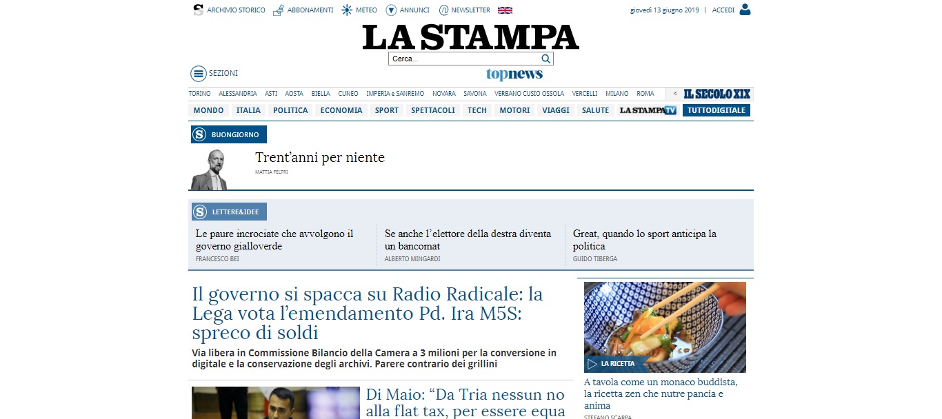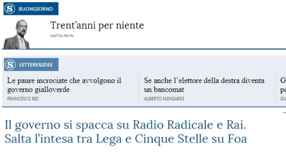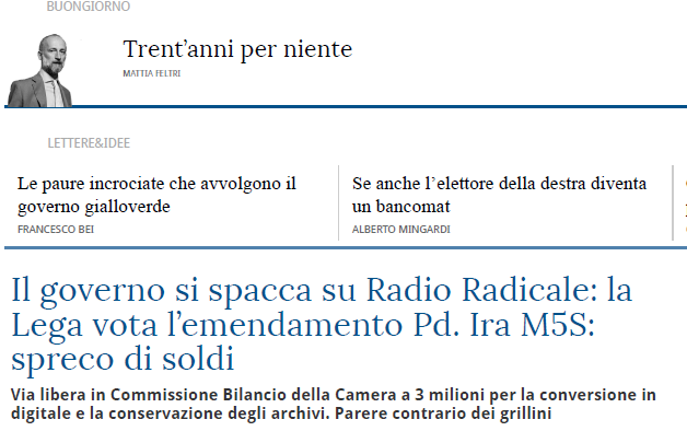Ossia, i media mainstream come La Stampa sono ormai a favore della Lega, assieme al PD. Esiste l’accordo ormai, temo. La prova sta nella iniziale mancata sostituzione dei ministeriali del PD al governo lo scorso anno, con i gialloverdi al comando delle operazione. A seguire la mozione pro miniBOT di due settimane fa preparata, come da trascrizione stenografica della Camera, da Forza Italia e PD, con mera sottoscrizione della Lega (i media questo lo hanno taciuto). In ultimo il fulgido esempio sopra di allineamento col PD su Radio Radicale.