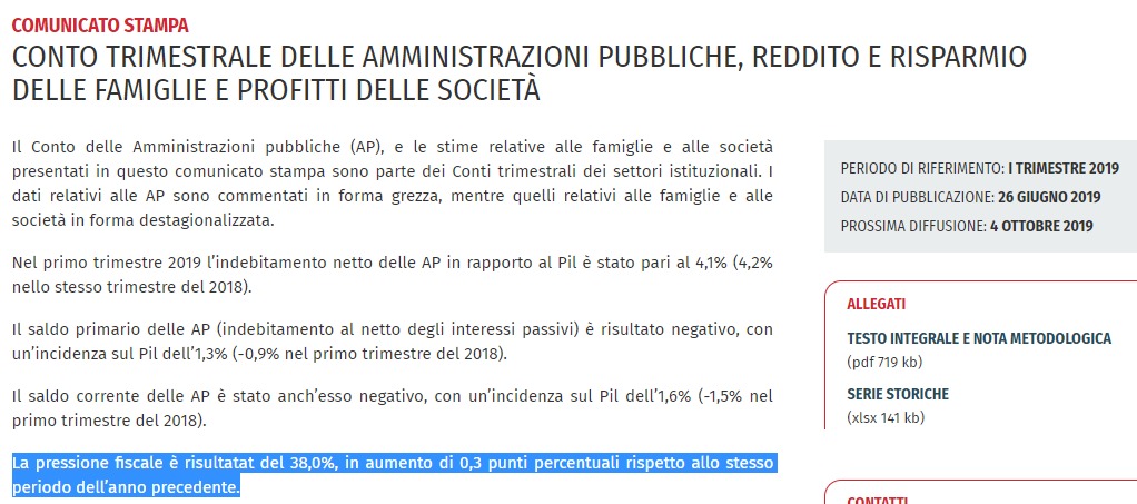 Che Salvini tratti con l’EU è positivo, anzi, sempre che non ceda su tutta la linea comefu col deficit al 2,04% della manovra 2019. Certo, se le tasse dovessero alzarsi ulteriormente le cose andrebbero malissimo. Ora, ragioniamo sui fatti: la pressione fiscale è in salita, lo dice l’ISTAT nel Conto delle Amministrazioni pubbliche del primo trimestre 2019 (vedasi oltre e QUI). Ossia, tutta la propaganda sulle tasse basse richia di essere un mero slogan, per forviare: flat tax, migranti, “non ci piegheremo all’EUropa” servono per tenere la gente tranquilla, in realtà le tasse salgono e dunque il cercare di mettersi d’accordo con l’EU diventa questione sinistra.