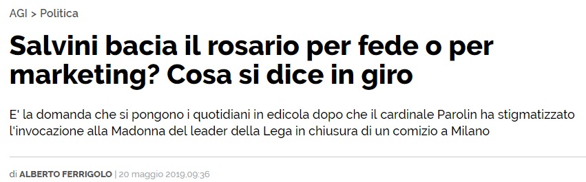 Forse sono fesso io ma da cristiano bisognerebbe ricordare a Salvini che i peccati, soprattutto se reiterati, non sono conformi alla morale cristiana: va bene non fare nulla per l’Italia dove invece ne abbiamo bisogno, l’economia, ma anche ripetere bugie a mitraglia, eh no caro Salvini, non è molto cristiano. Quindi la smetta di brandire i rosari fino a quando non farà qualcosa di concreto per il Paese.