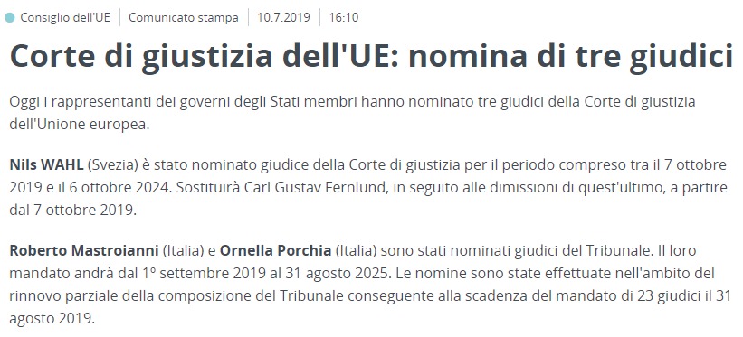 In breve, due giudici italiani sono stati nominati negli scorsi giorni alla Corte di Giustizia Europea : trattasi di Ornella Porchia e soprattutto Roberto Mastroianni. C’è però un fatto saliente: tali soggetti, che saranno giudici EU in carica fino al 2025 (!!!) sono stati tra i consulenti di Sandro Gozi (PD) al ministero delle Politiche Comunutarie col governo PD; parlo di un politico della sinistra italiana che addirittura si è candidato in Francia per il partito di Macron, arcinemico deigialloverdi. I due neo-giudici italiani risultano infatti essere vicinissimi all’ex ministro Gozi ossia alla sinistra che, lo ricordo, non governa più in Italia da oltre un anno. Nulla di illegale, che sia chiaro, ma resta lo sconforto su come il governo italiano attuale NON riesca ad incidere veramente sulle nomine EU, così almeno sembra: non era forse auspicabile proporre soggetti di estrazione diciamo governativa attuale? Ossia gialloverde?