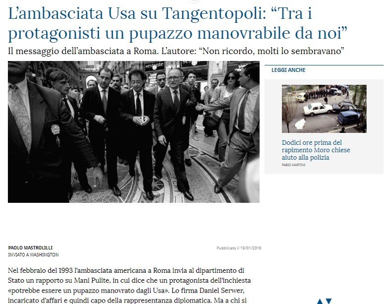 Appunto, come nel 1993 gli apparati usati per lo scopo furono gli stessi, facenti per altro riferimento allo stesso centro di potere, gli USA a comando Dem (vedasi l’articolo de La Stampa sotto, immagine, a dimostrarlo; ossia con soggetti apicali affiliati alla nascente EU, vedasi oltre). Pochi infatti ricordano che durante Tangentopoli c’era Bill Clinton al potere, un Dem; nel 2011 invece c’era la Dem Hillary Clinton capo di Stato in pectore, assieme all’avatar del sistema Barack Hussein Obama. In realtà nel 1993 la vendetta contro Italia – che aveva inopinatamente annunciato l’esistenza della struttura Gladio – partì dall’apparato militare USA, che evidentemente aveva preparato il casus belli, con primo obiettivo il soggetto che fu l’eroe di Sigonella quando difese i confini e l’onore italiani nell’affaire dell’Achille Lauro (parlo di Bettino Craxi)(…).