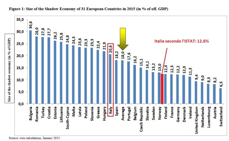 Il conto è presto fatto, ecco il metodo da seguire: dalle ultime stime l’Italia è al 12,6% di economia sommersa rispetto al PIL mentre la Germania è circa al 10,4% del PIL (Fonte: Institute for Applied Economic Research at the University of Tübingen, rilevazioni ultime del 2017). Diciamo 2,1% punti percentuali. Ossia detta economia sommersa italiana sarebbe pari a circa 32 miliardi di euro (2.1%xPIL). Applicando lo stesso metro usato dal Sole 24 ore (il 50% del sommerso equivale alle tasse non pagate su tale economia “non dichiarata”, viste le varie aliquote di tassazione nazionali oltre che l’IVA), potremmo recuperare 16-17 miliardi di euro di tasse (2.1%xPILx50%), una somma che non farebbe certo la differenza visto che solo la manovra che l’EU vuole dall’Italia solo nel 2019 (entro fine anno) assomma a circa 40 miliardi di euro.