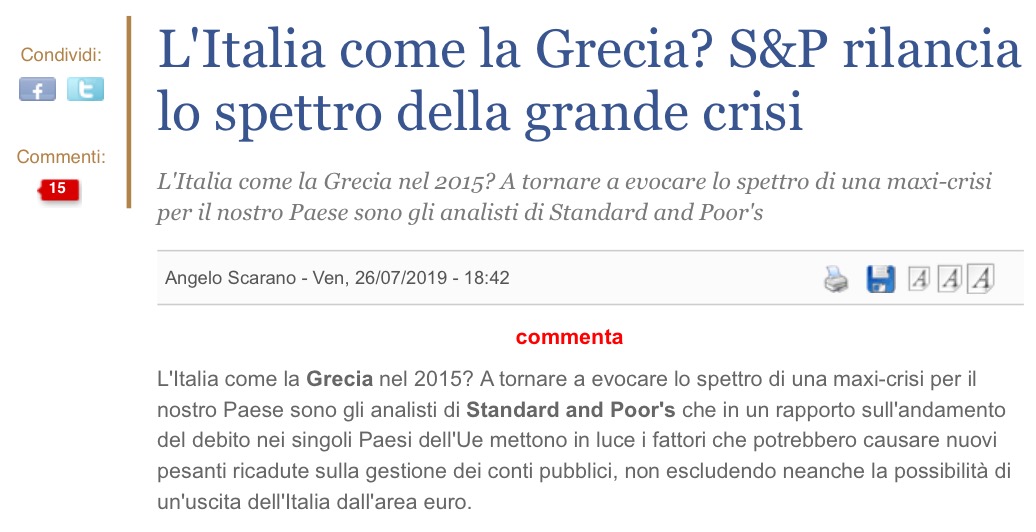 Insomma, ad oggi a livello economico la Lega purtroppo, di pratico, ossia in termini di miglioramento del benessere delle famiglie italiane, ha fatto poco o nulla. Dunque, i punti/fronti aperti indicati sopra (escluso il blocco dei migranti – che però non dà da mangiare agli italiani -) sono stati nulli o insufficienti. Ovvero il benessere in discesa delle famiglie italiane continua col suo trend implosivo. Ripeto, DECIDENDO DI RESTARE NELL’EURO, le tasse bisognerà alzarle, non è infatti possibile accumulare deficit e debito senza far nulla. Questo andrebbe detto chiaro. Prima o poi saranno i mercati a mettere a posto le cose. Ovvero, bisognerà scegliere tra la troika o le tasse, INEVITABILE, a voi la decisione. Chi scrive, oltre a ritenere un errore grossolano aver rinnegato l’ITALEXIT (lato Leghista, soprattutto con Boris Johnson oggi a Downing St.), non è necessariamente contro un Governo “in particolare”; dunque si continuerà ad essere una spina nel fianco per coloro che dicono le cose “solo in parte” ovvero manipolando la realtà, fors’anche dicendo bugie. Si vorrebbe solo coerenza da parte di chi governa… solo questo. Mitt Dolcino
