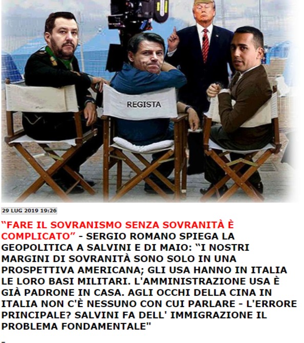Questo per dire che non importa dove (oggi) mangiano non il popolo italiano ma le poche persone dell’establishment italiota da sempre cooptate [pagate] dai poteri centro EU (è una prassi europea veterocoloniale pagare pochi eletti per fottere interi popoli, da secoli); infatti se è vero che il piano inclinato va verso la disgregazione dell’Italia, è parimenti certissimo che gli USA non molleranno l’osso. Osso che non è più il governo di Roma attuale, ieri anche l’ambasciatore Sergio Romano riconosceva candidamente che la forza pro-USA al governo oggi sono i pentastellati e non la Lega (LINK).
