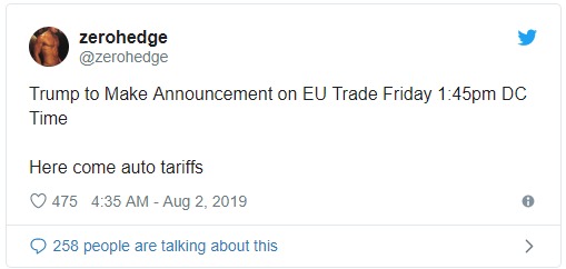 Notizia bomba: gli USA annunceranno a breve dazi contro… l’EU! Saranno dazi auto? Forse, sebbene personalmente non lo creda, saranno direi dazi generici, che colpiranno ad ampio spettro tutto il Vecchio Continente. I dazi USA sull’auto verranno dopo, ossia saranno l’arma “quasi finale”; ossia, dopo il fallimento annunciato di Deutsche Bank (…), verranno imposti con decorrenza due mesi, giusto il tempo per fare le trattative di resa con Berlino. Intanto la Cina è praticamente in ginocchio, il piano USA si sta infatti svolgendo come da aspettative… Tutti pensano che la Cina sarà il paese vincente: ne siete davvero sicuri? Con il supporto di Londra, Pechino ha il fronte aperto ad Hong Kong. Userà l’esercito? Speriamo di no. O forse meglio che lo usi, almeno arriveremo rapidamente all’epilogo: Hong Kong che si ribella ai militari cinesi significa che la finanza lascerà l’Impero Celeste, pronta a traslocare a Sidney o a Tokyo. Vedremo… Per intanto aspettiamo i dazi contro l’EU, annunciati per oggi. Facile, no? In fondo un paese come la Cina che esporta 600 mld di dollari di merci negli States e ne importa meno delle metà, non ha armi per difendersi da tali ritorsioni commerciali. Sappiamo ormai che gli USA vogliono correggere gli squilibri di bilancia commerciale – costi quel che costi – e per fare questo vogliono un dollaro debole, anche se con inflazione. La Cina non vuole questo, anzi lo combatte, idem la Germania; e quindi vediamo alimentare bolle finanziarie globali per tenere il dollaro in alto, riciclando i dollari nella borsa USA, sperando di convincere le elites USA (che dalla salita di borsa ci guadagnano enormemente) ad affossare Trump. Peccato che non ci riescano: la Cina ha il timer attivato, se non limita Trump nel giro di 6 mesi partirà la stagflazione nella sua terra. Sapete che la stagflazione in Cina è la vera malattia mortale per un paese di 1.4 miliardi di abitanti? MORTALE! Non ve l’hanno detto gli economisti? Lo so, gli economisti arrivano sempre dopo che le cose sono successe, a maggior ragione se sono una primizia assoluta. Io però sono ingegnere e quindi degli economisti me ne faccio un baffo, tra l’altro ne ho conosciuto uno romano recentemente, non vi dico… Stay tuned, today.