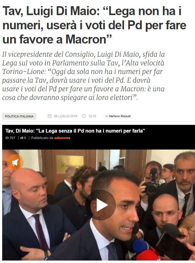 Ci provano, come sempre. Ed i nostri due capponi litigano (sono due scellerati) non fanno nulla, troppo impegnati a litigare fra loro. Devo però rilevare uno strano aspetto: chi va regolarmente contro i francese, con i fatti, è sempre il M5S (ad esempio dichiarando lo scandalo del franco CFA con cui la Francia schiavizza l’Africa subsahariana, andando a testa bassa contro la TAV [nell’interesse dell’Italia, ndr], ieri chiedendo – giustamente – di cancellare la cittadinanza italiana a Sandro Gozi). Salvini invece con Parigi abbaia solo ma mai morde: come mai? Forse perchè gli sono cari gli appalti alla TAV gestiti dal suo amico Lunardi? Forse perchè il suo caro Berlusconi deve prendere dai francesi circa 1.5 miliardi di euro da Vivendi a fronte dell’attracco kamikaze a Mediaset, attacco avvenuto guarda caso nel bel mezzo della conversione del Cavaliere al più spiccato EUropeismo?