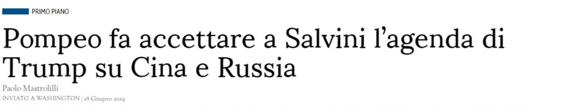Appunto, Salvini non è necessariamente amico degli USA, ha anzi cercato di usare Washington per perseguire suoi affari (politici?); ad esempio il caso Metropole, da manuale, solo per essere “sgamato” clamorosamente. Oggi Washington sta combattendo una battaglia EPOCALE con la Cina (non con l’Iran) e dunque anche i “modi buoni” con gli alleati sono stati messi da parte: lo spirito yankee aleggia e dunque chi di dovere ha fatto capire che non ci sono “se o ma”, ci si adatta e basta. Punto. Da qui la svolta di Salvini, che sembra sempre più l’utile, se non “idiota”, certamente il “limitato”. Nel senso, nessuno ai piani alti di via Bellerio, parlo dei rappresentati degli imprenditori padani nella Lega, Giorgetti in testa, vuole veramente uscire dall’euro, ossia NESSUN LEGHISTA VUOLE affondare Berlino. Dunque Salvini ed i suoi Metropolitani cincischiano facendosi qualcosa di simile ai cavoli loro (cosa che coincide con il supportare indirettamente i piani franco-tedeschi, infatti soprattutto i francesi a livello affaristico lasciano fare, …), mentre l’Italia scivola progressivamente dentro la deriva francese, che la farà diventare vera colonia.