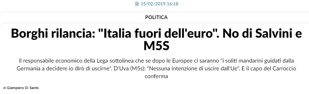 Oggi L ‘articolo sara’ breve e coinciso; partendo dalle parole di Borghi e riportandole ai numeri si scopre che questa crisi di governo non nasce con le intenzioni, finalmente, di fare il bene dell’Italia e degli italiani, questa crisi non nasce perché tra M5S e Lega c’è una totale diversità di vedute su questa Europa delle regole e del pareggio di bilancio, insomma l’ormai essenziale argomento dell’Italexit non fu inserito nel contratto di governo solo perché a parole non lo vollero i grillini, ma anche perché nei fatti non lo vuole neanche Salvini.