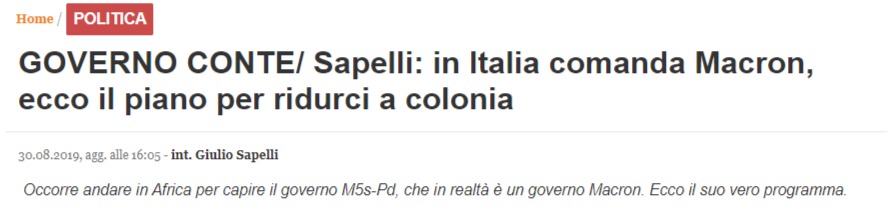 Noi riteniamo che la persona giusta per il ruolo, facendosi di lato il Salvini, possa essere Giulio Tremonti, un soggetto con le credenziali giuste oltre che la credibilità e la preparazione adatte per affrontare le dure sfide che ci aspettano, allineati al fronte che vuole correggere le pericolose derive iper-globaliste capeggiate dall’asse franco tedesco in EU, i cui paesi dominanti sono di fatto “a letto” con la Cina. Essendo per altro certi che, con un soggetto così a garanzia del fronte conservatore non solo locale, le elezioni italiane arriverebbero molto rapidamente (…).