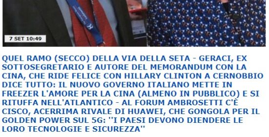 Fa per altro pensare la frequentazione dello stesso Geraci con Hillary Clinton, a Cernobbio, questo week end. Ben ricordando che Geraci fu mandato dal governo gialloverde a trattare i dazi USA di Trump, spedendolo proprio negli States, anche questo resta inspiegabile: visto che Geraci era colui che aveva cucinato il deal con la Cina, mandarlo negli States non fu proprio una mossa che andava nella direzione degli interessi degli italiani, o sbaglio? O ne avrà approfittato per andare a trovare Hillary Clinton durante tale visita negli States? Ah, a saperlo….