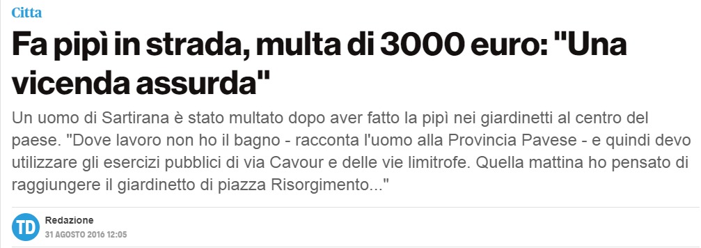 L’operazione “tassare anche l’aria, ma con una scusa buona” è già in atto: si va da far cassa sulle merendine, sbandierando la salute della gente, alle multe per tutto, incrementate, esplosive, abnormi. Pensate che in Italia c’è una vera e propria esplosione delle multe per chi fa pipì per strada: 3’000 euro. Tanto che, sapendo che le forze dell’ordine sono assatanate di multe, i bar ed i ristoranti offrono il pacchetto completo ormai, caffè e bagno 5 euro! Ditemi voi…..