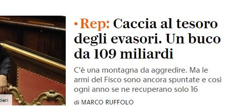 Io non so più come dirlo: l’evasione fiscale stimata oggi per l’Italia è pari a 109 mld di Euro. Tale valore resta prima di tutto un valore STIMATO e non necessariamente reale. In secondo luogo l’evasione fiscale è tanto più alta quanto più elevate sono le tasse: per assurdo quest’anno se si aumentassero le tasse del 50%, i 109 mld di euro salirebbero il prossimo anno fino a ca. 164 mld. Tradotto: è un cane che si morde la coda, se il governo aumenta le tasse il prossimo anno ci sarà qualcuno che vi dirà, a parità di PIL, “che l’evasione è aumentata” (in realtà sarebbero solo le tasse ad essere aumentate). Tradotto: se si aumentano le tasse l’evasione statistica aumenta. In tutto questo sappiate che i miliardi recuperabili dall’Italia non supererebbero i 30-35 mld. Ecco perchè.