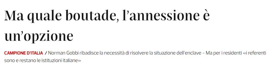 ‘ Norman Gobbi che, qualche giorno fa, ha dichiarato come «l’annessione alla Svizzera sarebbe una soluzione dato che l’Italia non riesce a risolvere la crisi di Campione». ‘