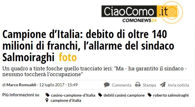 Il problema parte dal fatto che l’Italia non sembra in grado – ne sembra, incredibilmente, abbia voglia, nè abbia i soldi – di risolvere i problemi di campione, come ben dice il consigliere di Stato ticinese Norman Gobbi. La ragione è presto detta: Campione ha un debito di 140 milioni di franchi, circa 125 milioni di euro, che nessuno vuole saldare. Tra i principali creditori c’è proprio la Svizzera, che infatti vuole rientrare dei propri debiti. Al limite, se non verrà ripagato il debito, quello che capiterà è che la Confederazione giustamente si rifarà coi ristorni dovuti ai comuni italiani.