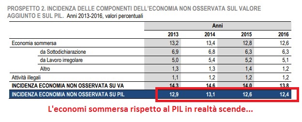 L’errore nella versione – forviante, fattualmente – data dal Fatto Quotidiano sta nel tacere che negli anni considerati il PIL è aumentato più dell’economia sommersa…