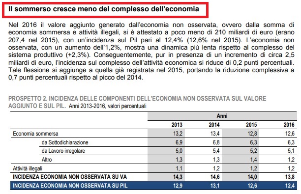 Il punto sta tutto nel metodo, ossia per capire la realtà bisogna usare – appunto – il metodo. Dunque, chi è che detiene i dati di economia sommersa in Italia? Chi è che li elabora per conto di Eurostat? L’ISTAT, tale fonte è quella preminente anche per l’EU in tema di economia sommersa. Dunque, evitate di leggere quello che dicono i media interessati, andate direttamente alla fonte (i media come Il Fatto Quotidiano sono evidentemente interessati ad aumentare controlli e tasse, ossia a dare più potere ai giudici, ndr). Andate dunque a guardarvi questo LINK, dell’ISTAT, regolarmente, per capire quale sia veramente l’economia sommersa italiana effettiva. E per capire che tale economia sommersa italica scende da anni, al contrario di quanto vi vogliano fare credere!