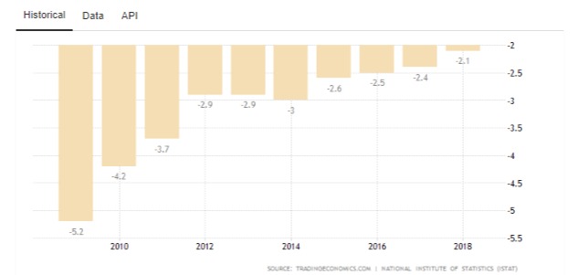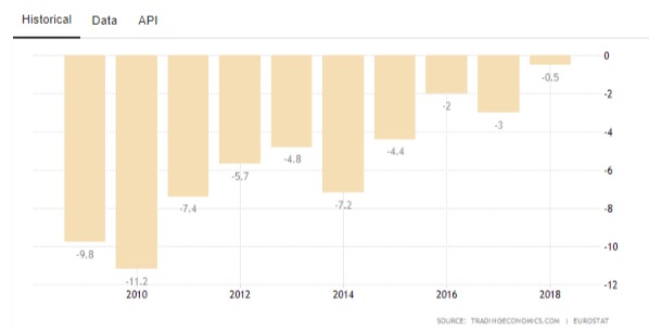 Sopra il deficit statale in % del PIL del Portogallo negli ultimi 10 anni; sotto quello dell’Italia (per forza il Portogallo è cresciuto e l’Italia no! In Italia nessuno ha chiesto di fare lo stesso di Lisbona…)