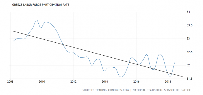“…Sfortunatamente, la qualità dei lavoratori potrebbe peggiorare: circa 400.000 greci sono emigrati negli ultimi otto anni per lavorare all’estero, la maggior parte di loro non solo laureati, ma anche titolari di un master. Questa fuga di cervelli ha un enorme impatto sulla crescita economica in quanto influenza la produttività e l’innovazione, entrambe significative per la crescita economica. Ci sono molti fattori che influenzano la produttività, ma sicuramente l’educazione è uno di questi. Inoltre, secondo la Commissione europea, le prestazioni di innovazione della Grecia dal 2010 al 2017 sono diminuite dello 0,9% e la Grecia è considerata un modesto innovatore. Inutile dire che è lo stesso periodo in cui la fuga di cervelli è stata più intensa. Viene portato di seguito un esempio della riduzione alla partecipazione al lavoro dei greci, che è crollata causa emigrazione…”