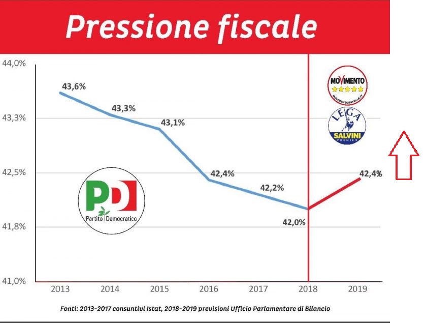 Ben ricordando che le tasse in Italia sono aumentate l’anno scorso, infatti il NA-DEF giallo-leghista prevedeva un aumento delle tasse nei successivi 5 anni per un ammontare addirittura superiore a quello previsto dalla coalizione giallo-PD oggi (la pressione fiscale aumentò anche con la lega al governo, ndr). Nonostante questo gli stessi soggetti che si lamentavano l’anno scorso per l’aumento delle tasse gialloverdi fanno la stessa, precisa, identica cosa in queste ore….