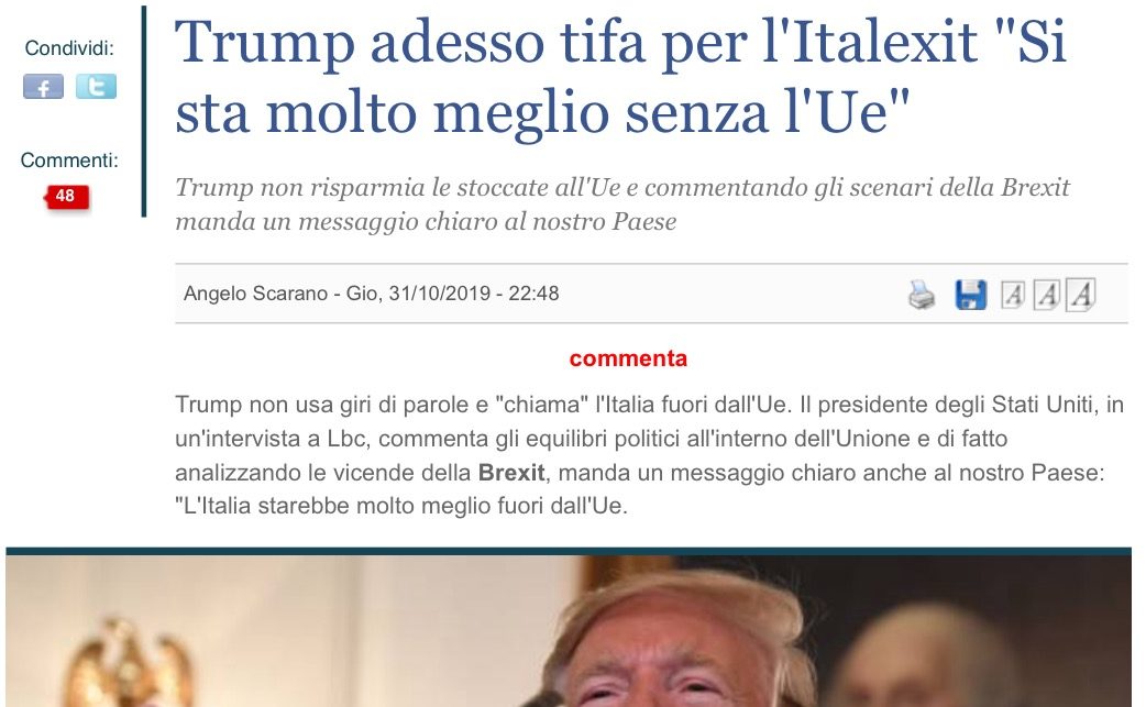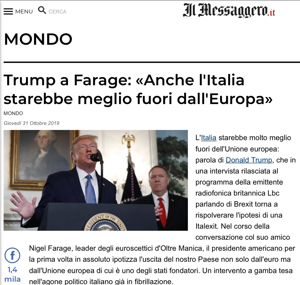 Che Trump decida oggi, nel critico contesto attuale, di farci un regalo post Brexit, appunto l’ITALEXIT, non deve farvi gioire. In realtà questa è una marchetta che i leghisti hanno deciso di rifiutare dietro spinta EU (che “mantiene” le famiglie di molti leghisti e che punta alle autonomie delle macroregioni alpine ossia del nord, il vecchio piano bossiano) ma non sanno quanto costerà il rifiuto, vedasi l’ “euro irreversibile”. E comunque, nel caso, non sarà Trump a portare l’Italia fuori dalla EU, ma Boris Johnson! Ma solo dopo la Brexit… Ossia oggi i più pro euro sono gli stessi che ieri volevano l’ITALEXIT: Forza Italia e Lega su tutti.