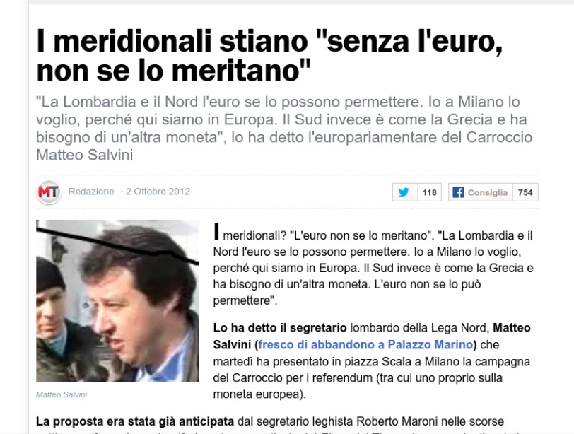 La nuova strategia leghista infatti è non fare nulla, aspettare che l’euro cada da solo: versione comoda, così nel mentre si tiene la cadrega. Peccato che ciò implichi subire tutte le conseguenze negative del non fare nulla, sebbene molti voti siano arrivati in forza del no euro pre elettorale. Finirà male cari miei, sappiatelo.