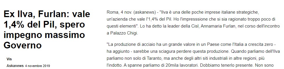 Notate bene che ridurre drasticamente le operazioni della sola Ilva in Italia sembra comporterà la riduzione del PIL nazionale di ca. l’1%: se a questo aggiungiamo il ridimensionamento voluto dai francesi per le operations di FCA in Italia, rischiamo, senza considerare crisi economiche, recessioni o altre disgrazie aggiuntive, tra indotto e tutto una riduzione del PIL che può essere in aggregato tra il 2020 ed il 2021 di ca. il 2% del PIL all’anno. Sapete cosa significa questo spero…. Che lo Stato italiano salterà, a partire dall’INPS. Da lì la logica dice che il nazismo fiscale prenderà vera forma, eventualmente anche con le intercettazioni per dichiarazione infedele dei singoli cittadini e ribaltamento dell’onere della prova a 360 gradi sul contribuente (un unicum mondiale nel mondo industrializzato quello in cui l’accusato deve dimostrare di essere colpevole in ambito fiscale e non viceversa, chiamasi “ribaltamento dell’onere della prova”, una aberrazione del diritto, ndr). Della serie, “io Stato ti prendo quanto ritengo che tu mi devi dai, dopo sarai tu cittadino a dovermi dimostrare che ho sbagliato per vedere restituito quello che ti ho sequestrato a garanzia“. O qualche “reazione reazionaria” per evitare che questo accada. Basta attendere….