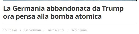 In tale contesto l’idea idiota dei post-sovranisti di aspettare che l’euro si rompa da solo EU è una emerita BUGIA per nascondere altro, temo, bugia interessata a cui anche il prof. Bagnai sembra credere. Infatti Berlino gioca sul tempo: per lei basta resistere, tirare lungo ed alla fine vincerà, comunque. Ossia, farà arrivare la troika nel paese più filo USA dell’EU, l’Italia.