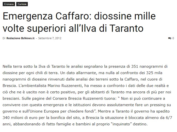 Chissà allora a Brescia cosa bisognerebbe fare, bisognerebbe deindustrializzarla per tagliare l’inquonamento? Anche perchè sembra che l’inquinamento bresciano non derivi solo dalla Caffaro – che è vicina al centro della Città – purtroppo…