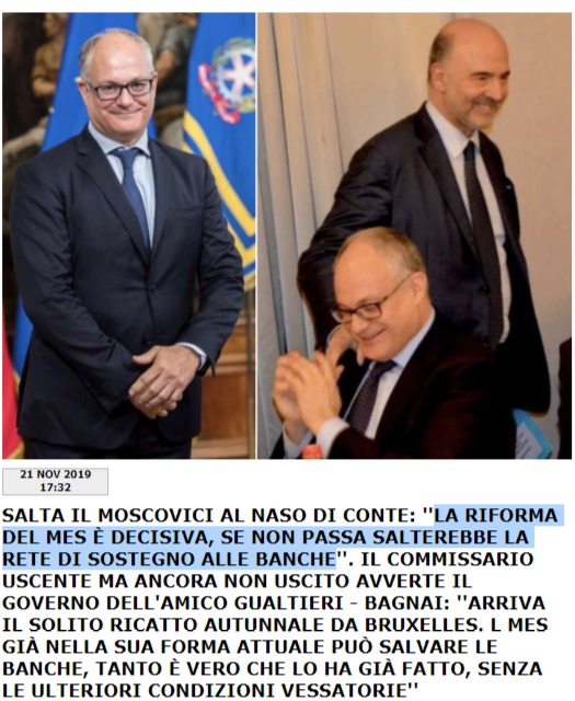 Giulio Tremonti fu colui che profeticamente anticipò la crisi in arrivo per l’Italia (peggio del 2008). E fu anche colui che cercò di fare tutto il possibile per evitare di essere travolto come Paese nel 2011, con Berlusconi che non si sapeva dove si fosse nascosto, irreperibile al climax della crisi euroimposta (partita dalla vendita di BTP da parte di Deutsche Bank, …). Evidentemente Tremonti era ben informato, sia allora che oggi. O forse è solo attento, ad es. è risaputo che la riforma del ESM (MES) va infatti avanti da mesi, se non da anni. Ossia passando anche per il Consiglio dei Ministri del governo giallo-leghista, con l’argomento specifico discusso in consiglio dei ministri. Ma questa è un’altra storia.