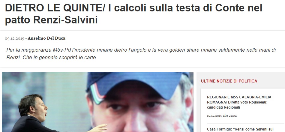Dunque, a questo punto le buone maniere vanno messe da parte, visto che è l’Italia ad avere bisogno e non viceversa (…). O meglio, gli italiani hanno bisogno degli USA e degli UK mentre i politici italiani temo si siano già fatti comprare, dai franco-cinesi e da qualche tedesco, sebbene marginalmente. Questo Washington l’ha capito benissimo, soprattutto quando ha mandato il messaggio twitter a Conte, approvando il suo primo ministero a fine agosto scorso. Sapete il motivo? Per affossare il renzusconi, ai tempi inevitabile. Ecco perchè Salvini e il sempre obamiano Renzi sono diventati anti-Trump, spero l’abbiate capito.