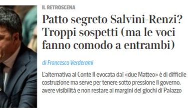 Prendete Salvini: dice in TV di non volere un accordo con Renzi e poi leggiamo sui giornali che va a pranzo con l’ex sindaco fiorentino a casa Verdini in Toscana; che tenta di fare un accordo con Renzi per un governo di unità nazionale (peccato che questo sia avvenuto dopo aver distrutto i ponti politici con tutti); dopo che la Meloni lo supera a destra e verrà incontrata addirittura da Trump nelle prossime settimane (a Renzi e Salvini fu invece detto che non erano “omologhi nei ruoli” e dunque non si potevano incontrare). E pur dopo che sono passati mesi senza che Salvini abbia tirato fuori uno straccio di proposta al vero problema italiano, ossia un piano economico credibile e serio, che a questo punto non può NON comportare l’ITALEXIT come estrema ratio…..