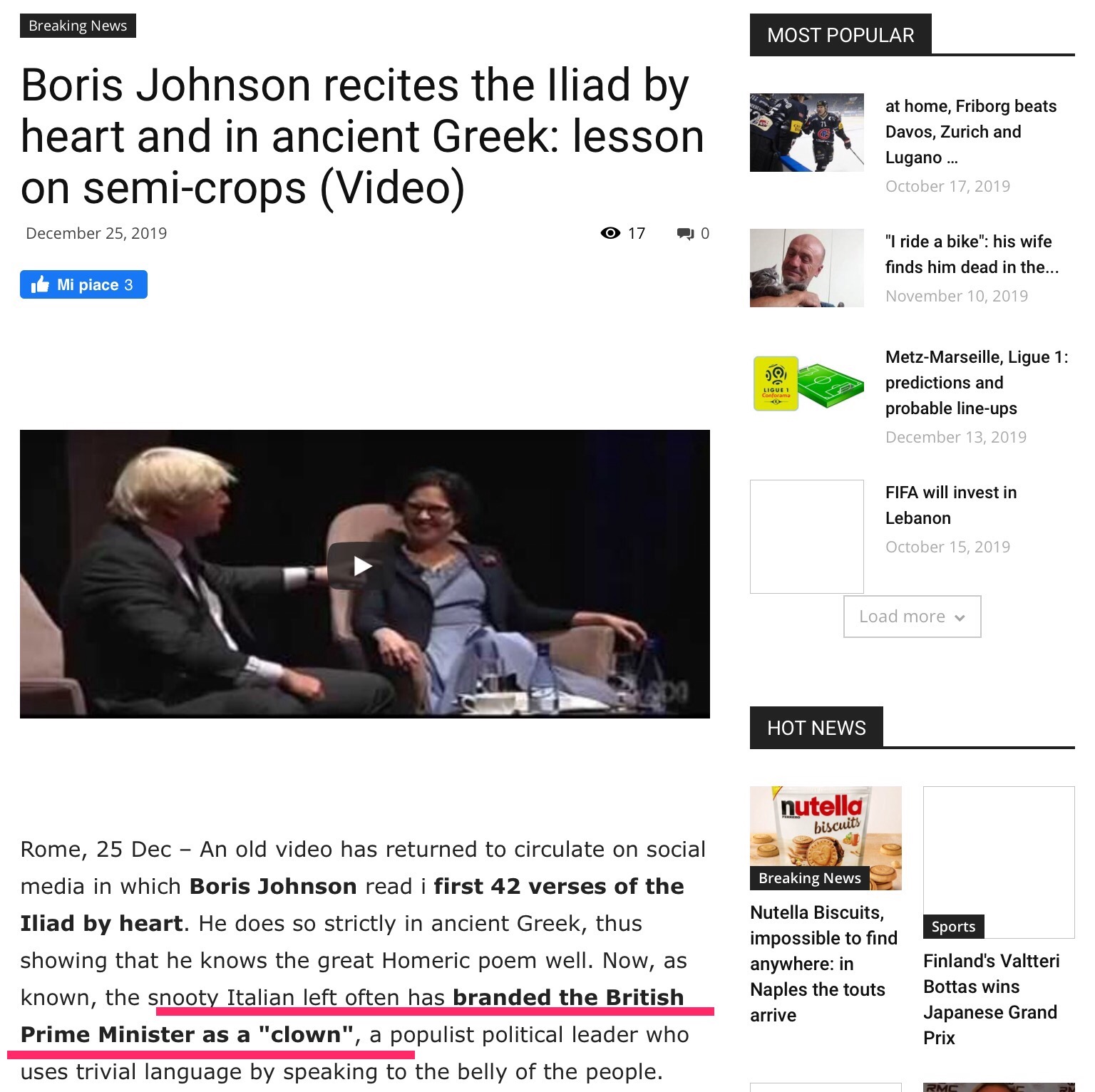 Che il Natale vi porti la Meritocrazia: Boris Johnson, considerato da molti media Italiani quasi come un clown (vergogna), recita 42 versi dell’Iliade a memoria. In greco antico…