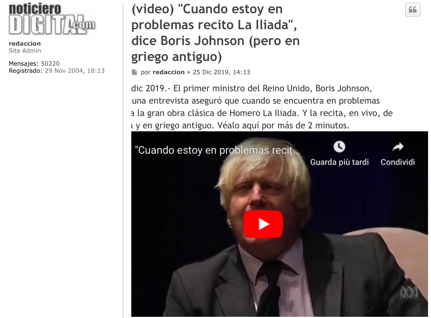 Che il Natale vi porti la Meritocrazia: Boris Johnson, considerato da molti media Italiani quasi come un clown (vergogna), recita 42 versi dell’Iliade a memoria. In greco antico…