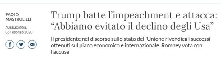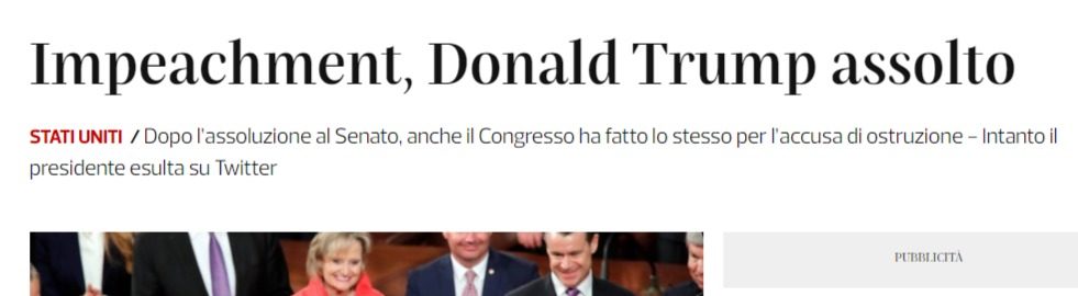 Tanto per chiarire … visto che i media italiani non stanno comunicando con la dovuta rilevanza  quella che poi sarebbe la notizia del giorno: Trump NON è colpevole, è stato assolto dal Senato. Ovvero, tutti gli attacchi ricevuti si sono conclusi in una bolla di sapone, in quella che è stata un’autentica caccia alle streghe. Questo dev’essere chiaro a tutti.
