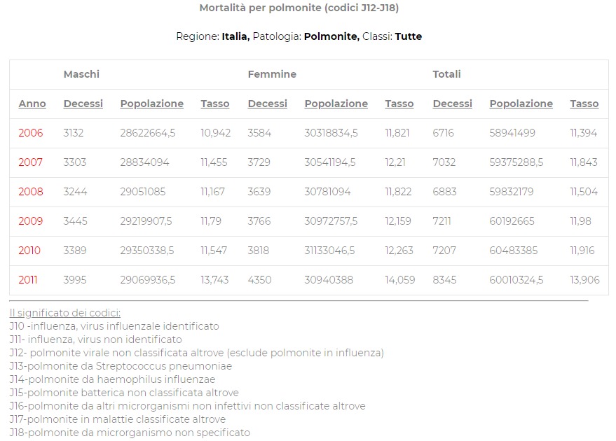 Dunque, stante il fatto che i morti per influenza “normale” potrebbero essere maggiori di quelli per il coronavirus, vi allego anche qualche statistica, dell’ISTAT, a conforto. Come vedete la polmonite è qualcosa che flagella da anni l’Italia…., sotto.