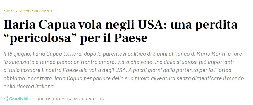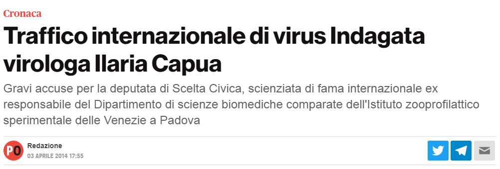Per non farsi mancare nulla, non possiamo riportare alcuni fatti. Ossia non possiamo non ricordare ad es. la ministra italiana che fu indagata per anni dalla polizia italiana per, guarda caso, “traffico di virus”, la famosa Ilaria Capua, poi emigrata negli States a fare ricerca sempre sui virus senza il rischio di essere considerata una untrice (…, e qui ci sarebbe da scrivere qualche libro sull’argomento). Interessante casualità che anche la prof. Capua fosse indagata proprio nel padovano, da enti legati all’istituto zooprofilattico.