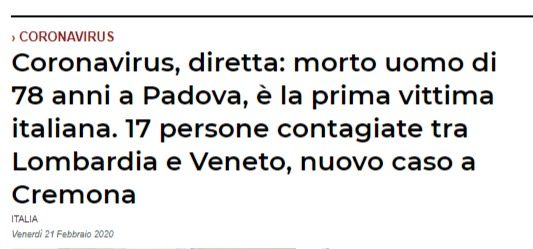Or dunque, oggi abbiamo un morto a Padova (un anziano di 78 anni) e una decina di contagiati, casi dubbi. Nessuno sa da dove arrivino i contagi, ma si sa solo che i casi sospetti sono avvenuti principalmente tra Lombardia, Veneto e nord Emilia, una zona abbastanza ristretta. C’è da spaventarsi? Mah, magari mi sbaglio ma ad oggi a me sembra che sia molto più spaventosa l’influenza….