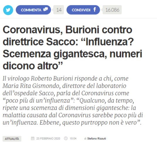 Se prendessimo per buone le tesi ricavabili dalle affermazioni di D’Anna molto sembrerebbe tornare: dalla prof. Capua che diceva che il virus si trovava perchè “veniva cercato“, al fatto che i casi lombardi sono presenti in numero anomalo rispetto a quelli del resto dell’Europa e d’Italia; e anche con la versione del capo del laboratorio di virologia dell’ospedale Sacco, Gismondo, colei che sembra averlo analizzato in prima persona il virus, la quale affermava che si trattava di un virus simil-influenzale e non di una piaga (solo per poi essere ripetutamente attaccata sui media dal virologo massmediatico Roberto Burioni, vedasi oltre, …).